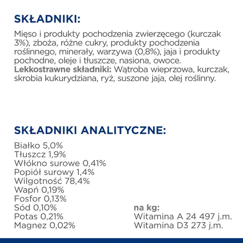 - Wysoce strawne składniki: wątroba wieprzowa, kurczak, ryż, białko z jaja