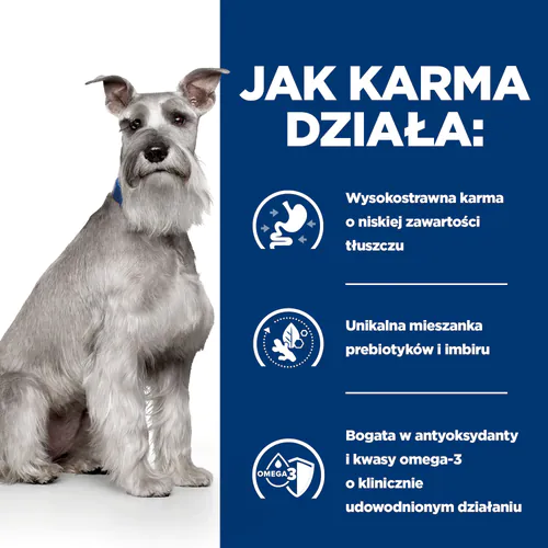 Dietetyczna karma Hill’s Prescription Diet i/d Low Fat zaspokaja potrzeby żywieniowe Twojego psa i może być stosowana przez długi okres. Skonsultuj się z lekarzem weterynarii, aby uzyskać więcej informacji na temat tego, jak karmy Prescription Diet mogą pomagać Twojemu psu cieszyć się aktywnym życiem w zdrowiu. Suche i mokre karmy można mieszać lub podawać jednocześnie.