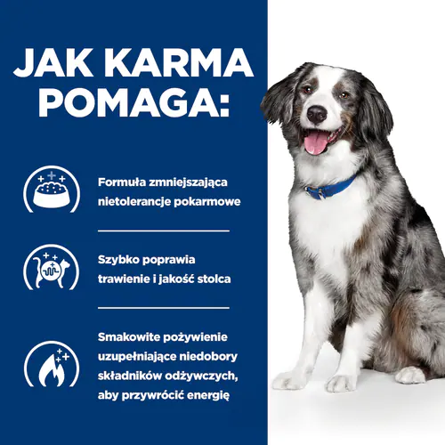 Hill’s Prescription Diet Canine i/d Sensitive to lekkostrawna karma opracowana specjalnie do stosowania u psów z zaburzeniami przewodu pokarmowego, które są wrażliwe na pokarm. Wyselekcjonowane źródła białka (całe jajo) oraz węglowodanów (ryż browarniany) pomagają ograniczyć objawy nietolerancji pokarmowej. Zapewnia kompletne zbilansowane żywienie dla dorosłych psów i nadaje się do długotrwałego podawania. Wysokostrawne białko zapobiega powstawaniu niepożądanych reakcji na pokarm. Wysoki poziom niezbędnych nienasyconych kwasów tłuszczowych warunkuje utrzymanie prawidłowej funkcji skóry.