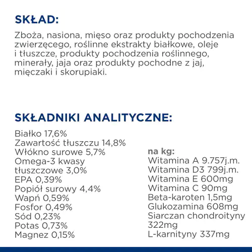 Karma dla psów Hill’s PRESCRIPTION DIET j/d to pełnoporcjowa dietetyczna karma wspomagająca metabolizm stawów w przypadkach choroby zwyrodnieniowej stawów oraz wydolność serca w przypadkach przewlekłej niewydolności serca u dorosłych psów. Ta karma ma wysoką zawartość EPA, wysoką całkowitą zawartość kwasów tłuszczowych omega-3 i witaminy E oraz ograniczoną zawartość sodu.