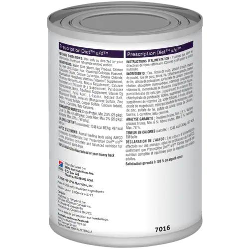 Karma dla psów Hill’s PRESCRIPTION DIET u/d to pełnoporcjowa karma dietetyczna wspomagająca redukcję powstawania kamieni moczanowych oraz redukcję powstawania kamieni z cystyny u dorosłych psów. Ta karma ma umiarkowaną zawartość aminokwasów siarkowych, niską zawartość puryn, niską zawartość wysokiej jakości białka, wybrane źródła białka oraz ma własności alkalizujące mocz.