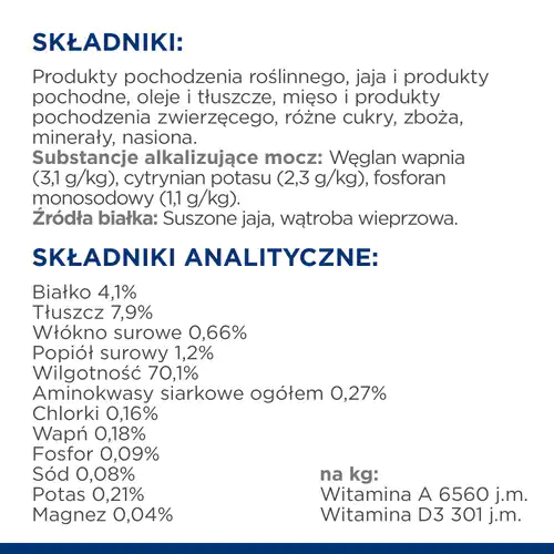 • Substancje alkalizujące mocz: węglan wapnia (3,1 g/kg), cytrynian potasu (2,3 g/kg), diwodorofosforan sodu (1,1 g/kg)