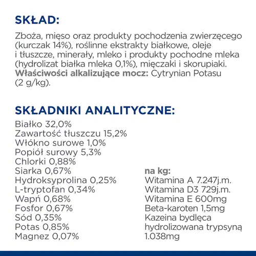 Hill’s Prescription Diet c/d Feline Urinary Stress Kurczak to żywienie o udowodnionym klinicznie działaniu redukującym nawroty objawów FIC i zawiera składniki do kontroli stresu, który jest znanym czynnikiem ryzyka FIC (Idiopatyczne Zapalenie Pęcherza Moczowego Kotów). Do redukcji stresu przyczyniają się takie składniki jak tryptofan oraz hydrolizat białka mleka.