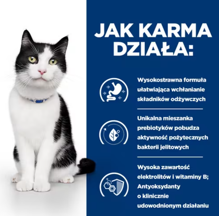 HILL’S PD Prescription Diet Feline i/d Hill’s Prescription Diet id Digestive Care to karma, która została opracowana specjalnie dla kotów z chorobami żołądkowo-jelitowymi lub ostrymi zaburzeniami absorpcji w jelitach. Karma ma zwiększoną zawartość elektrolitów, obniżoną – tłuszczu i lekkostrawne składniki żywieniowe.