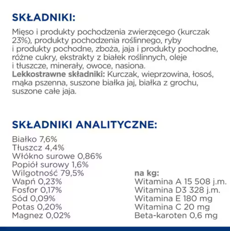 Ta soczysta karma mokra z drobnymi kawałkami w sosie zawiera 25% kurczaka i inne łatwo przyswajalne składniki, takie jak łososia czy białko z grochu. Wszystkie składniki łączą się, tworząc pełnowartościowy posiłek i pomagają zrównoważyć zaburzone procesy trawienne. Pokarm zawiera zrównoważoną mieszankę witamin, minerałów, pierwiastków śladowych i beta-karotenu. W ten sposób twój kot osiągnie dobrostan, a jego układ odpornościowy zostanie wzmocniony.