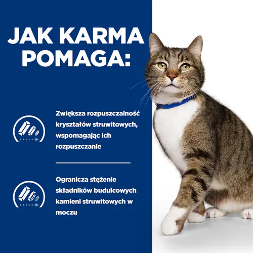 Karma dla kotówHill’s PRESCRIPTION DIET s/d z kurczakiem to pełnoporcjowa karma dietetyczna wspomagająca rozpuszczanie kamieni struwitowych u dorosłych kotów (przyczyna schorzeń dolnych dróg moczowych, FLUTD). Ta karma ma własności zakwaszające mocz i ma niską zawartość magnezu. Wspiera zdrowie układu moczowego Twojego kota. Kamienie moczowe to skupiska kryształów pewnych minerałów, które łączą się w pęcherzu moczowym. Mogą one powodować dyskomfort i prowadzić do poważniejszych problemów.