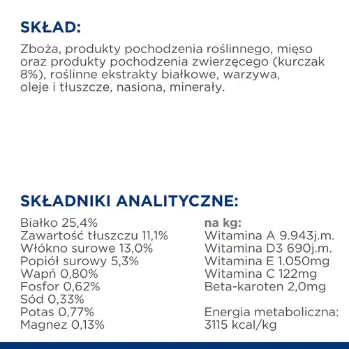 Karma marki HILL’S PD aktywizuje naturalne zdolności Twojego psa do spalania nadmiernej ilości tłuszczu, dlatego w bezpieczny sposób umożliwia systematyczne pozbywanie się dodatkowych kilogramów, które mogą powodować wiele poważnych problemów zdrowotnych, na przykład cukrzycy, dysplazji stawów biodrowych, zwyrodnienia stawów, nadciśnienia i problemów skórnych. Chrupiące krokiety zawierają dietetyczną mączkę z kurczaka i indyka, dlatego posiłki Twojego pupila są smaczne i odżywcze.