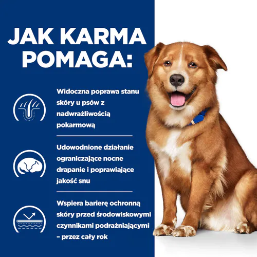Pełnoporcjowa karma dietetyczna dla dorosłych psów, opracowana w celu wspomagania funkcji skóry w przypadku dermatoz i nadmiernego wypadania sierści, a także ograniczania reakcji na alergeny pokarmowe i środowiskowe.