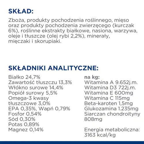 Karma dla psów Hill’s PRESCRIPTION DIET Metabolic + Mobility z kurczakiem to pełnoporcjowa karma dietetyczna wspomagająca redukcję nadmiernej masy ciała oraz do wspomaganie metabolizmu stawów w przypadkach choroby zwyrodnieniowej stawów u dorosłych psów. Ta karma ma niską gęstość energetyczną i wysoką zawartość EPA, wysoką całkowitą zawartość kwasów tłuszczowych omega-3 oraz odpowiednią zawartość witaminy E. Żywienie o klinicznie potwierdzonej skuteczności we wspomaganiu naturalnej utraty masy ciała przez psy oraz poprawie mobilności w czasie jedynie 21 dni. Nawet niewielka nadwaga może wpływać na jakość życia zwierzęcia i jego relacje z rodziną, ponieważ może skracać czas zabawy, wpływać na mobilność oraz mieć niekorzystny wpływ na ogólny stan zdrowia Twojego psa przez długi okres.