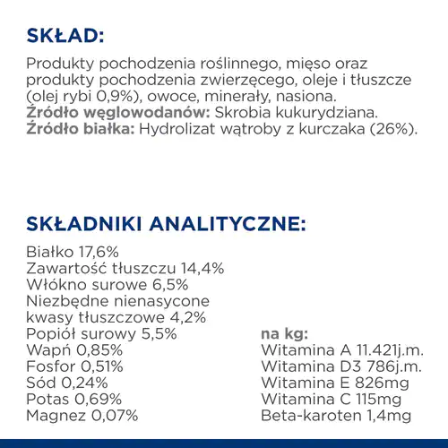 Wspomaga widoczną poprawę stanu skóry i sierści.