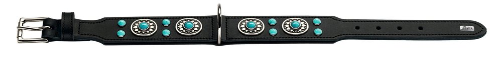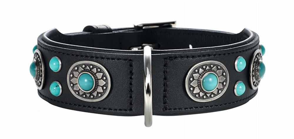 Cztery metalowe medaliony rozmieszone na całej długości obroży posiadają tłoczenia w gwiazdy. Prócz tego w każdym medalionie (oraz pomiędzy nimi) osadzone są kamienie – turkusy. Dzięki zastosowaniu czarnej skóry dekoracje wyglądają niezwykle szykownie i gustownie. Mimo bogatego zdobienia obroża jest bardzo wygodna i żaden z odstających elementów nie będzie psu przeszkadzał nawet podczas zwyczajnych czynności. Obroża nadaje się na specjalne wyjścia i spotkania z przyjaciółmi.
