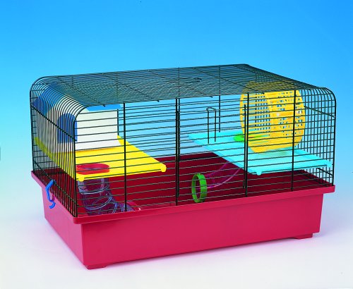 Klatka dla małych gryzoni (chomik, mysz, szczur). Dzięki odpinanej kuwecie klatkę łatwiej wysprzątać. Elementy klatki wykonane są z nietoksycznego plastiku. Górna część klatki wykonana jest z metalowych prętów pokrytych nietoksyczną farbą.