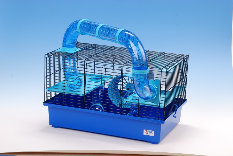 Klatka dla małych gryzoni (chomik, mysz, szczur). Dzięki odpinanej kuwecie klatkę łatwiej wysprzątać. Elementy klatki wykonane są z nietoksycznego plastiku. Górna część klatki wykonana jest z metalowych prętów pokrytych nietoksyczną farbą.