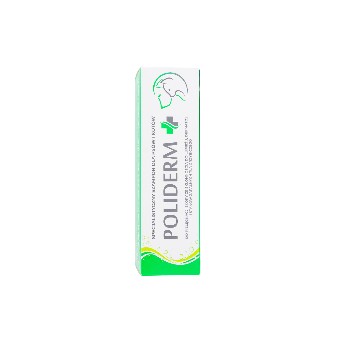 POLIDERM – SZAMPON 250 ml to preparat dla psów i kotów do domowej pielęgnacji skóry i sierści, który sprawdzi się również w pielęgnacji skóry skłonnej do łupieżu, dermatoz i stanów zapalnych tła grzybiczego. Preparat posiada odpowiednie dla skóry psów i kotów pH oraz likwiduje nieprzyjemny zapach. POLIDERM – SZAMPON 250 ml przywraca równowagę mikrobiologiczną skóry oraz oczyszcza, poprawia kondycję okrywy włosowej i zmniejsza świąd. W celu uzyskania najlepszych efektów zaleca się stosowanie produktów Poliderm naprzemiennie.