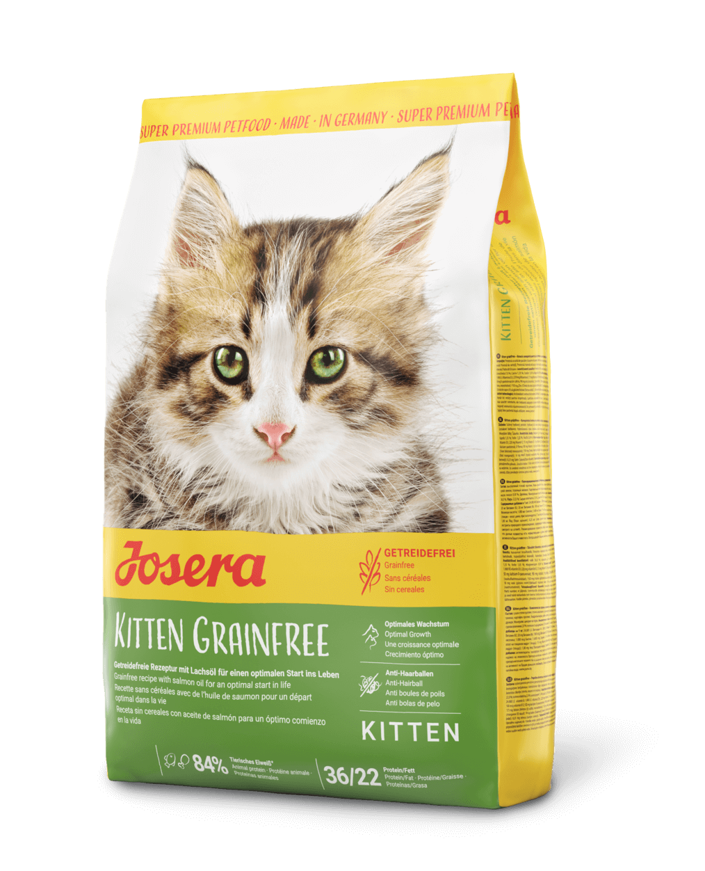 Josera Kitten GrainFree to bezzbożowa kama posiadająca lekkostrawną formułę z dużą zawartością drobiu oraz wysokim poziomem energii tak niezbędnym w kluczowej fazie rozwoju. Karma jest łatwo przyswajalna, ma dodatek specjalnych włókien, które zmniejszają ryzyko powstawania kul włosowych oraz dodatek oleju z łososia – źródła kwasu DHA.