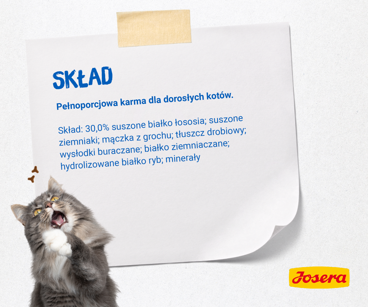 Josera Marinesse to kompletna, hipoalergiczna i lekkostrawna, w pełni zbilansowana karma z łososiem stworzona ze specjalnej receptury zaspokajającej potrzeby żywieniowe nawet najwybredniejszych dorosłych kotów. Polecana jest przede wszystkim kotom z wrażliwym układem pokarmowym, które cierpią na nietolerancję pokarmową. Chętnie spożywana przez koty żyjące w domu jak również te, które swój czas spędzają na powietrzu.