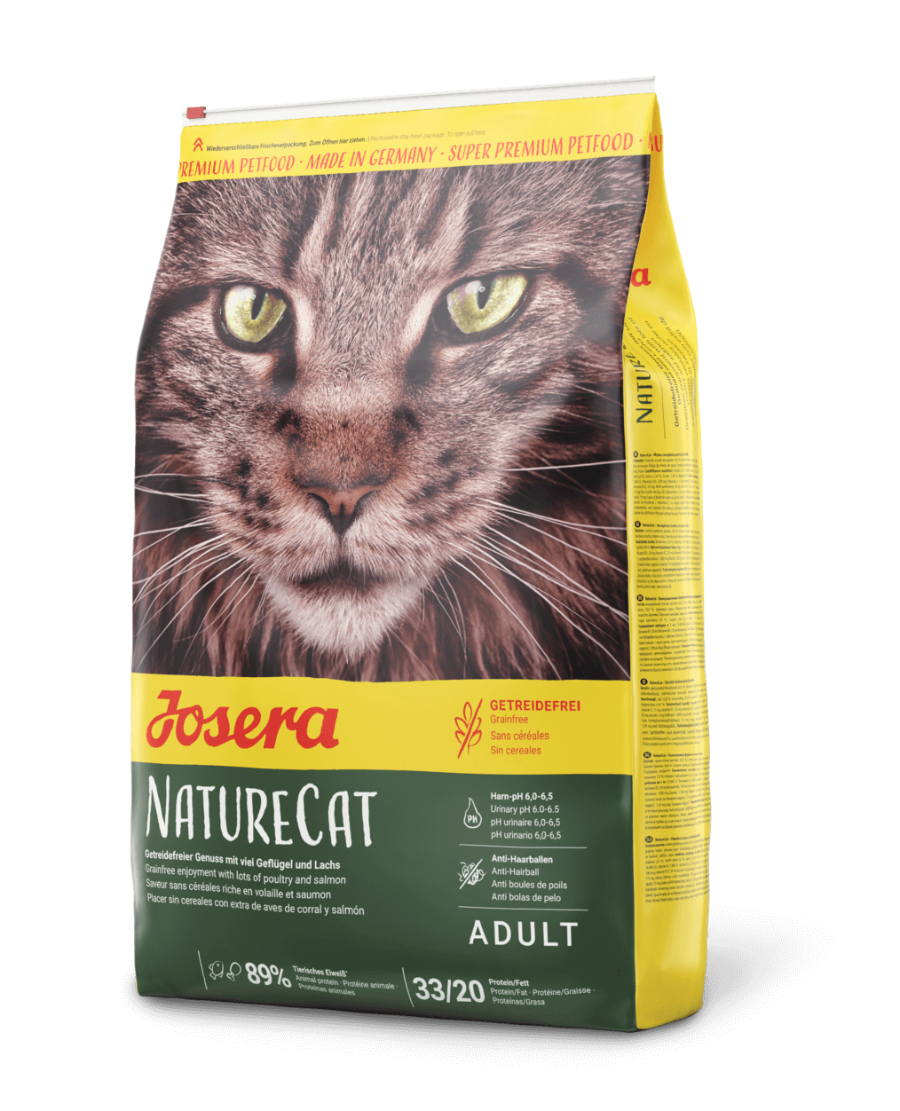 Wybranie odpowiedniej karmy dla kotów, których żołądki są wrażliwe na niektóre składniki znajdujące się w składach karm wymaga od nas analizy produktów co przekłada się czasami na poświęcenie sporej ilości czasu na to zadanie. Z pomocą przychodzi karma Josera Nature Cat dla dorosłych kotów. To wysokowartościowa, lekkostrawna, w pełni zbilansowana karma powstała ze specjalnej receptury nie wymagającej użycia przy jej produkcji zbóż. Karma wolna jest od różnego rodzaju sztucznych barwników i konserwantów. Składa się z wysokowartościowych, zdrowych i naturalnych składników. Idealny mix ziół, owoców i warzyw. W skład karmy wchodzi również drób (29%) i łosoś. Krokieciki pozbawione są składników z potencjałem alergennym. Kształt i wielkość krokiecików zostały dobrane tak, by przeżuwanie nie sprawiało problemów wszystkim kotom. Ograniczy to prawdopodobieństwo wystąpienia problemów trawiennych. Składniki użyte przy tworzeniu produktu mają pozytywny wpływ na skórę i sierść zwierzaka. Wspomagają również wydalanie połkniętej sierści.
