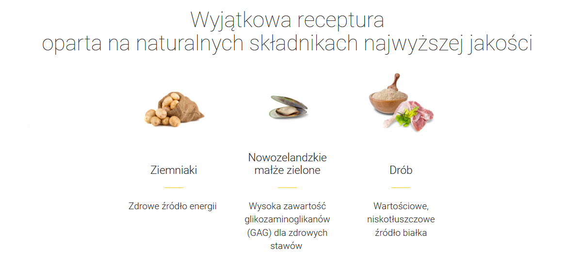 suszone ziemniaki 42 %, suszone białko drobiowe 30,0 % (w tym kurczak 40,0 %), tłuszcz drobiowy, wysłodki buraczane, mączka z chleba świętojańskiego, hydrolizowane białko drobiowe, drożdże, hydrolizowane białko roślinne, olej z łososia 0,8 %, minerały, suszony korzeń cykorii (naturalne źródło inuliny), suszone mięso nowozelandzkich małż zielonych (Perna canaliculus).