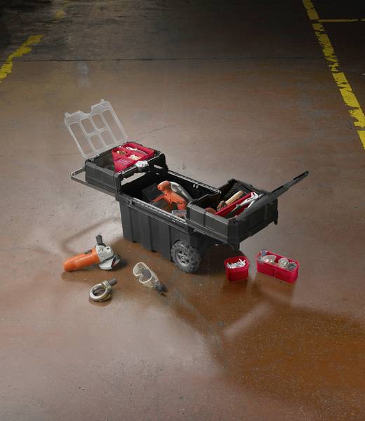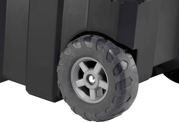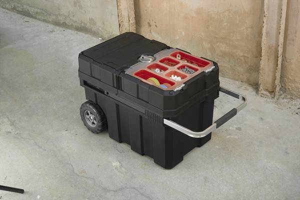 Mocna i wytrzymała skrzynka narzędziowa na kółkach z metalowym uchwytem. W kolorze czarno-czerwonym i o pojemności 65,3l.