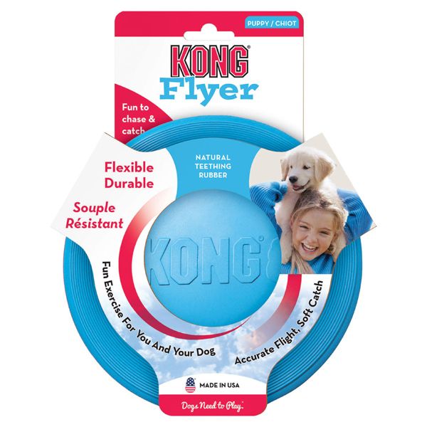 Kong Frisbee Puppy Flyer to zabawka wykonana z naturalnego kauczuku. Idealna dla szczeniąt do około 9 miesiąca życia. Bezpieczna dla uzębienia psa.