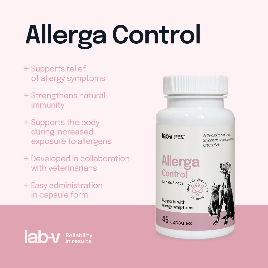 Lab-v Allerga Control wyróżnia się na tle konkurencyjnych preparatów dzięki swojej unikalnej formule, która łączy naturalne składniki roślinne i antyoksydanty wspierające zdrowie psów i kotów z alergiami. Preparat skutecznie łagodzi objawy alergii, poprawia kondycję skóry i sierści oraz wzmacnia naturalne mechanizmy obronne organizmu.