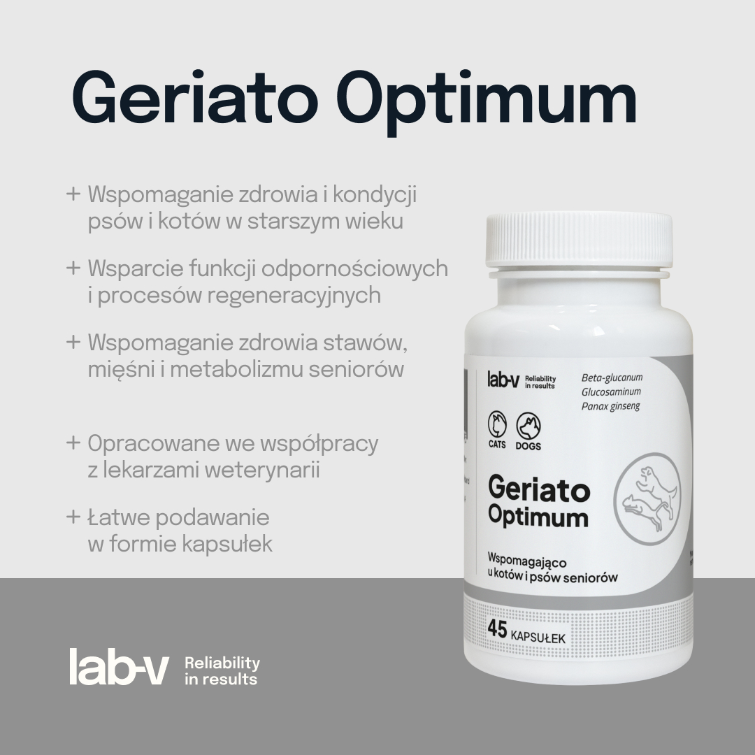 Geriato Optimum to preparat wspomagający zdrowie i witalność seniorów, zaprojektowany specjalnie z myślą o psach i kotach w podeszłym wieku. Jego formuła, opracowana przez lekarzy weterynarii, zawiera HMB, beta-glukan oraz glukozaminę, które pomagają w regeneracji, utrzymaniu sprawności stawów i ogólnej kondycji organizmu. Wspiera również funkcje odpornościowe, poprawiając ogólne zdrowie zwierzęcia.