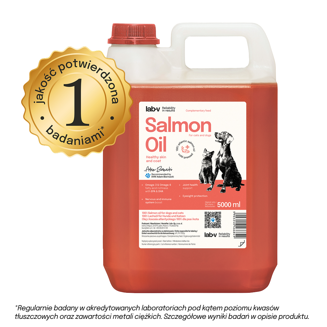 Lab-v Salmon Oil to naturalny sposób na poprawę zdrowia i samopoczucia Twojego czworonoga. Bogaty w nienasycone kwasy tłuszczowe omega-3 i omega-6, wspiera zdrowie skóry, sierści oraz układu pokarmowego. Dzięki właściwościom przeciwzapalnym, olej wspomaga trawienie i wzbogaca dietę zwierzęcia o cenne składniki. Jest to idealny suplement dla psów i kotów na każdym etapie życia, wspierający rozwój neurologiczny szczeniąt i kociąt oraz poprawiający funkcje poznawcze u starszych zwierząt. Olej z łososia pomaga w walce z chorobami serca, nerek i stawów, a także wspiera zdrowie skóry i sierści.