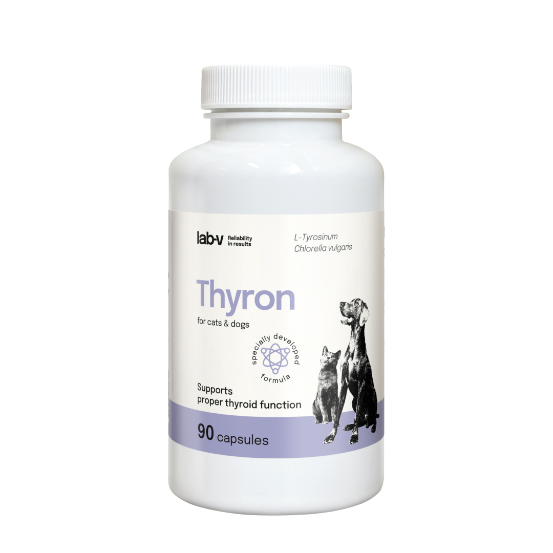 Lab-v Thyron – Wsparcie Prawidłowej Pracy Tarczycy dla Psów i Kotów 90 Kapsułek to specjalistyczny preparat opracowany we współpracy z lekarzami weterynarii, który wspiera prawidłową funkcję tarczycy u psów i kotów. Tarczyca odgrywa kluczową rolę w regulacji metabolizmu, poziomu energii i równowagi hormonalnej, dlatego odpowiednia jej funkcja jest niezbędna do zdrowia zwierzęcia. Thyron wspomaga produkcję hormonów tarczycy, poprawia metabolizm oraz ogólną kondycję organizmu.