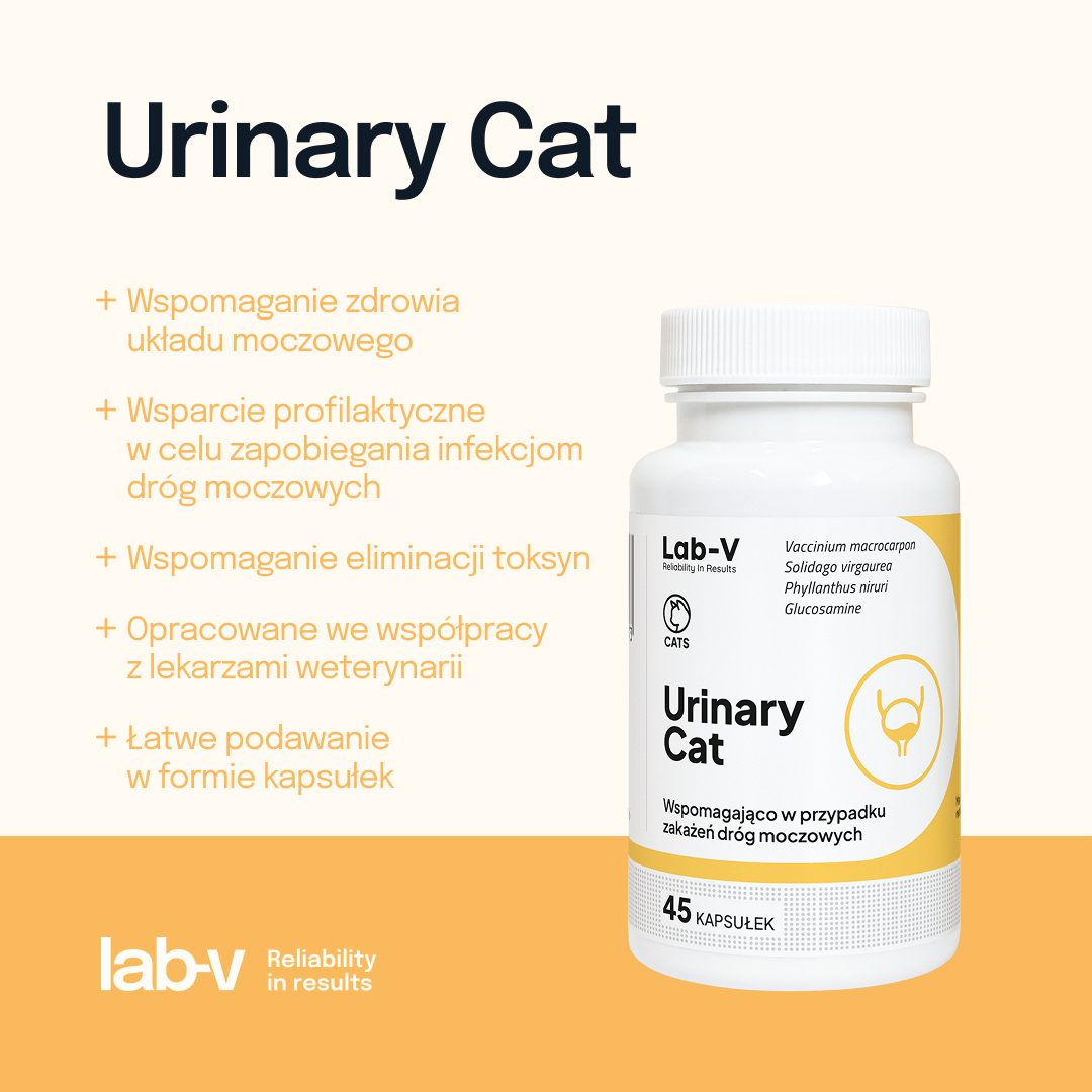 Urinary Cat to specjalistyczny preparat w formie kapsułek, opracowany z myślą o wsparciu zdrowia układu moczowego u kotów. Formuła, stworzona we współpracy z lekarzami weterynarii, zawiera glukozaminę oraz ekstrakty z żurawiny, nawłoci pospolitej i melisy lekarskiej. Preparat wspomaga prawidłowe funkcjonowanie dróg moczowych, zapobiegając infekcjom, kamicy nerkowej oraz stanom zapalnym.