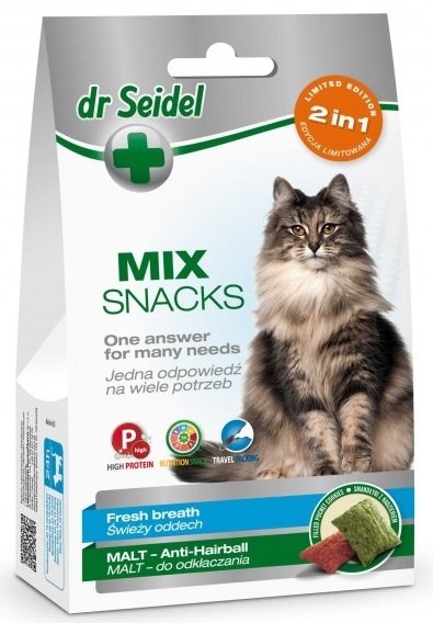 MIX dla kotów wzbogacony o dobroczynne substancje w ilościach odpowiadających suplementom diety. Tauryna wspomaga funkcjonowanie układu nerwowego. Ekstrakt słodowy zapobiega tworzeniu się kul włosowych. Chlorofil i Yucca Schidigera neutralizują nieprzyjemne zapachy. Smakołyki dr Seidla to smaczna i zdrowa przekąska między posiłkami. Ciasteczka w dwóch kolorach. Smakołyki na świeży oddech (zielone), smakołyki malt – do odkłaczania (czerwone).