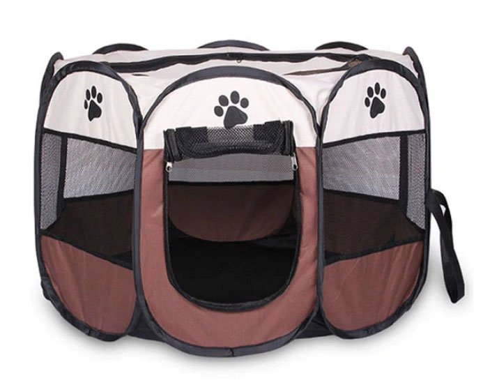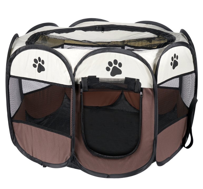 Składany kojec dla psa lub kota, wykonany z trwałego materiału łatwego w utrzymaniu czystości, w kolorze brązowym. Wymiary 74x74x43cm.