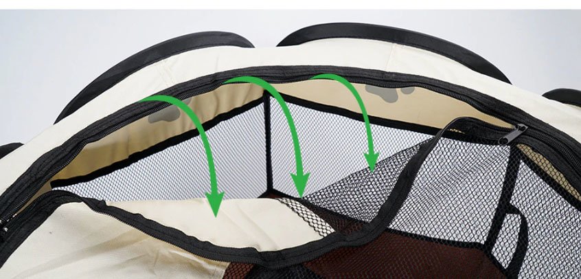 Górna część pokrywy została wyposażona w zamek błyskawiczny, dzięki któremu możemy stworzyć pupilowi bezpieczne schronienie. Co więcej, otwierana w ten sposób pokrywa ułatwia nam dostęp do zwierzaka. Niewielka masa oraz małe wymiary po złożeniu pozwalają na wygodne przechowywanie i przenoszenie kojca.