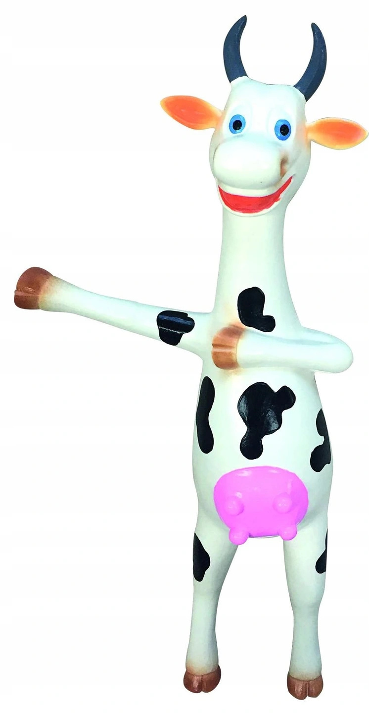 Zabawka lateksowa z piszczałką dla psa w kształcie krowy. Wyjątkowy design oraz dźwięk zapewnią psu niesamowitą zabawę. Długość zabawki to 30 cm.
