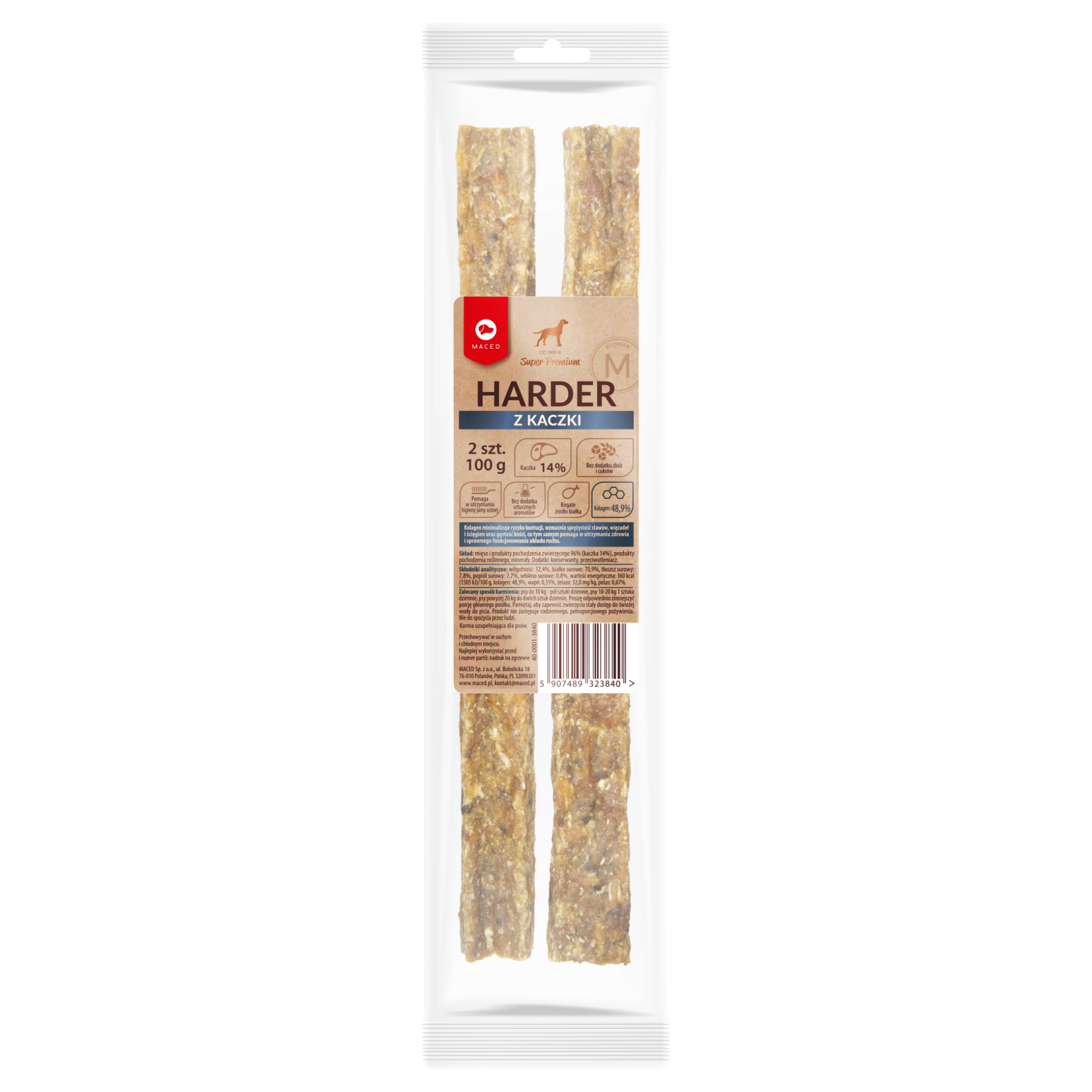 MACED Harder z Kaczki to twardy gryzak, który skutecznie pomaga w walce z kamieniem nazębnym. Produkt nie zawiera zbóż, cukrów ani sztucznych aromatów, co czyni go bezpiecznym i naturalnym przysmakiem dla psów.