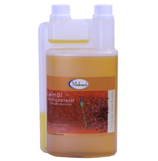 Olej lniany dla koni Makana jest bogaty w nienasycone kwasy tłuszczowe. Bez dodatku barwników, konserwantów, soli i GMO. Jest świeżo tłoczony na zimno z brązowego siemienia lnianego. W 100% bez dodatków. Olej lniany dla koni Makana zalecany jest przy zmianach paszy dla koni poprawia trawienie i działa osłonowo na błonę śluzową żołądka. Łagodzi podrażnienia dróg oddechowych przy przewlekłych chorobach takich jak RAO/COPD. Poprawia stan skóry i sierści.