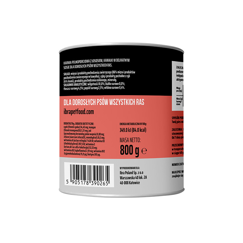 Mokra karma pełnoporcjowa dla dorosłych psów wszystkich ras, o smaku łososia w delikatnym sosie. Opakowanie 800g