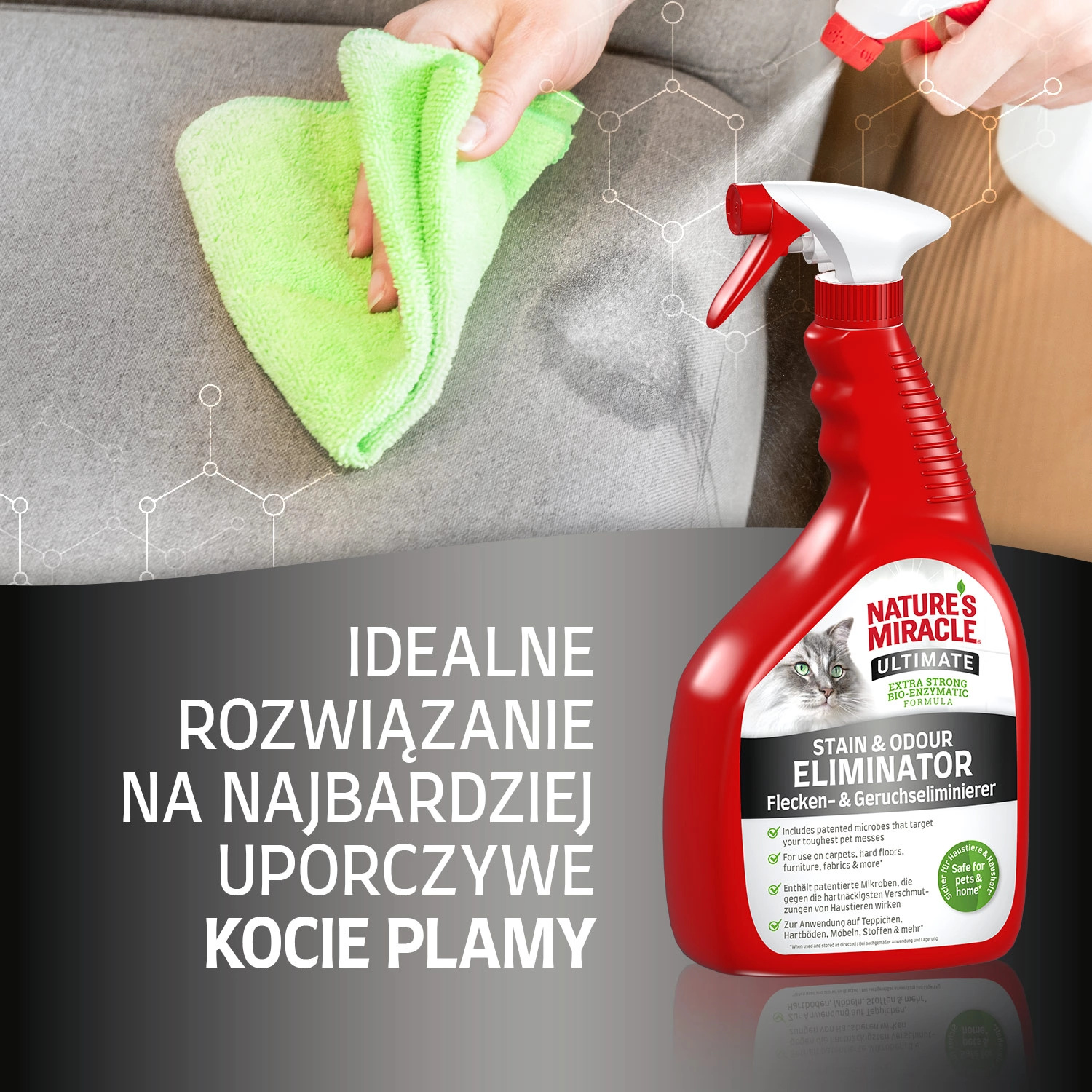 Środek stworzony specjalnie do usuwania trudnych zabrudzeń po kotach, takich jak mocz, kał czy wymiociny. Dzięki innowacyjnej formule bioenzymatycznej z opatentowanymi drobnoustrojami, skutecznie usuwa nawet najbardziej uporczywe zabrudzenia, neutralizując nieprzyjemne zapachy. Produkt jest bezpieczny dla zwierząt i przeznaczony do stosowania na dywanach, podłogach, meblach i tkaninach.