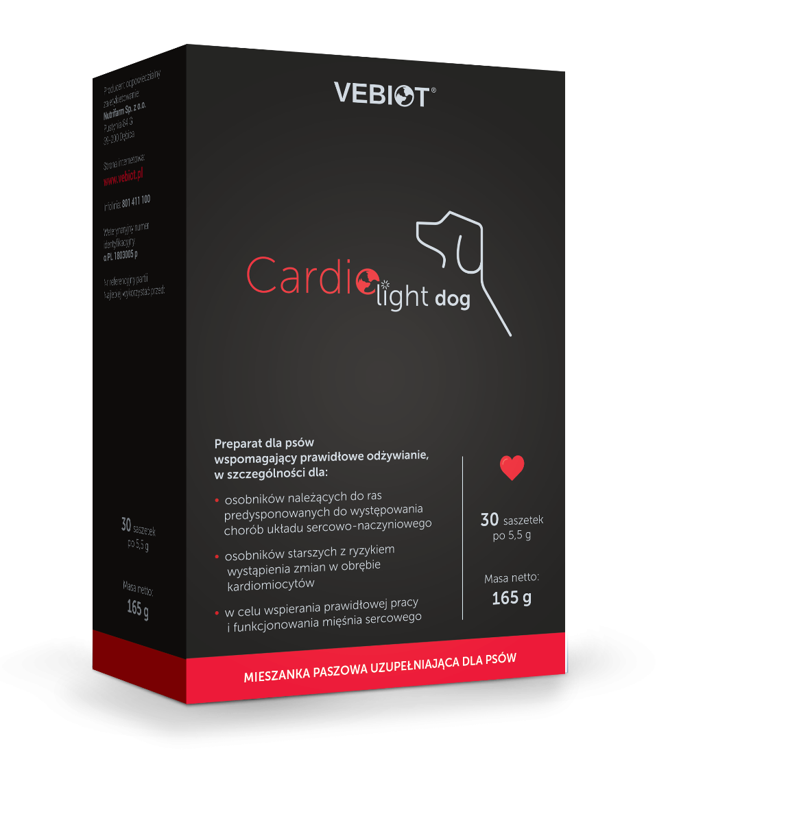 Cardio-light dog to preparat psów, który wspomaga ich prawidłowe odżywianie, w szczególności dla osobników należących do ras predysponowanych do występowania chorób układu sercowo-naczyniowego oraz dla osobników starszych z ryzykiem wystąpienia zmian w obrębie kardiomicytów. Składniki preparatu wspierają prawidłową pracę i funkcjonowanie mięśnia sercowego.