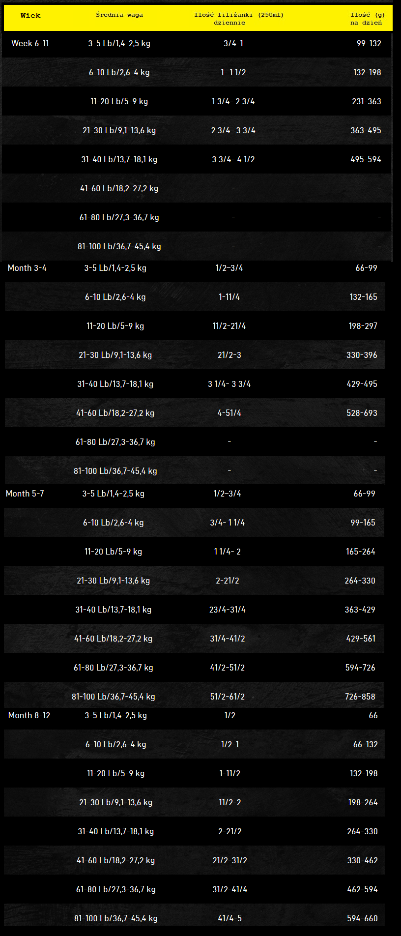 | 6-11 tydzień | 3-4 miesiąc | 5-7 miesiąc | 8-12 miesiąc | |
