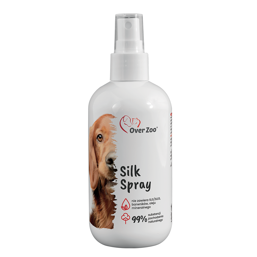 OVER ZOO Silk Spray – płyn ułatwiający rozczesywanie sierści dla psa 250ml znacznie ułatwi Ci pielęgnację zwierzęcia z dużą ilością podszerstka i suchym włosiem. Długie i gęste włosie często wykazuje tendencję do zbijania się w kłaki, których nie da się pozbyć w łatwy sposób. Ponadto usilne rozczesywanie bez środków wspomagających może powodować dyskomfort zwierzęcia, nadmierne wyrywanie sierści i niszczenie zdrowych włókien. Wyróżnikiem produktu jest opracowany prze ekspertów skład. Znajdują się w nim naturalne roślinne woski, które dobroczynnie działają na futro psów. Wygładzają je i nawilżają, dzięki czemu z łatwością można je rozczesać. Sierść na długo pozostaje lśniąca i miła w dotyku, ale bez efektu przetłuszczenia.