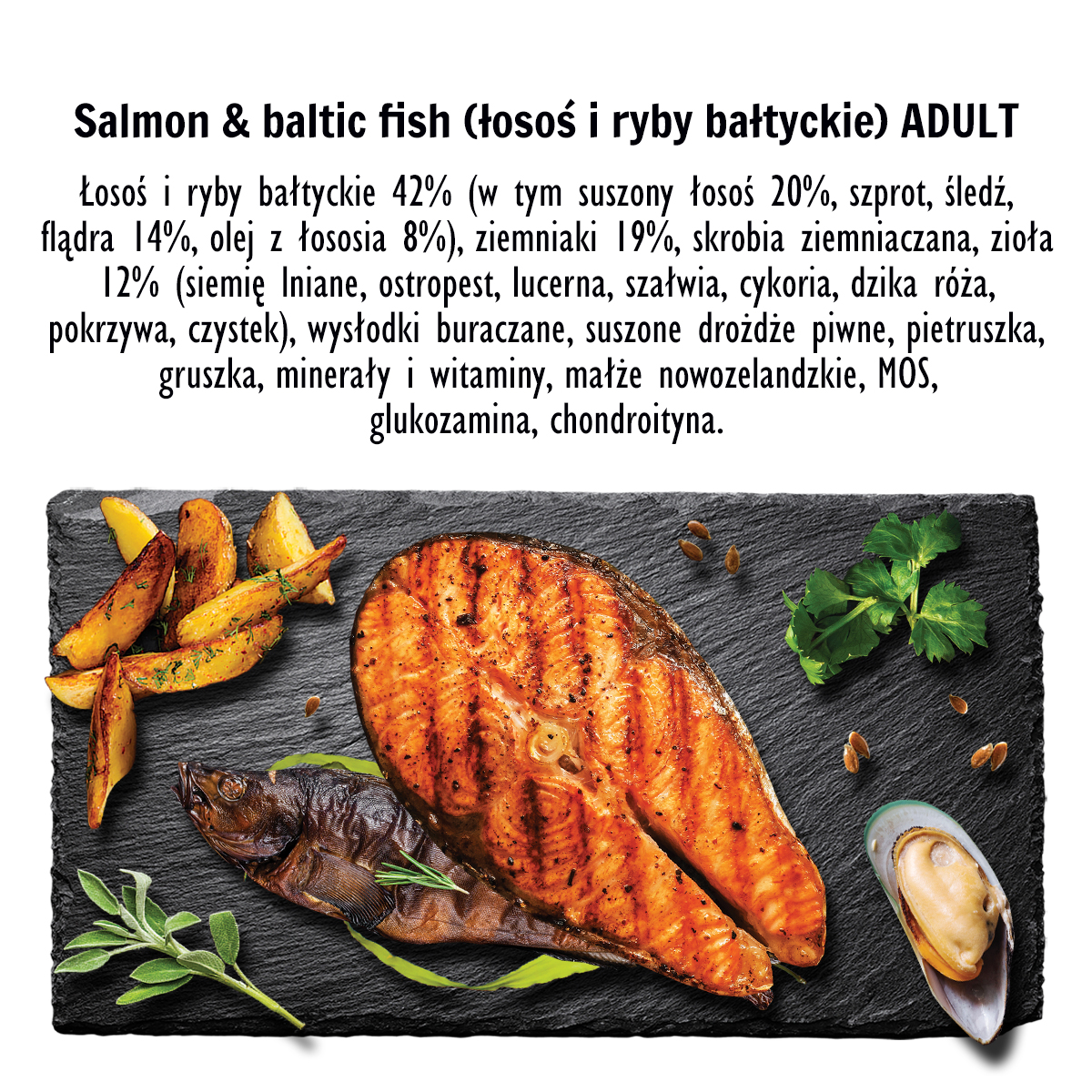 Doskonale zbilansowana karma sucha jakości SUPERPREMIUM pozbawiona zbóż, grochu, kukurydzy, soi, konserwantów i sztucznych barwników. Najwyższej jakości mięso łososia, ryb bałtyckich, warzyw i ziół pozyskiwane od lokalnych dostawców zapewnią wysoką smakowitość i łatwą przyswajalność. Idealna formuła dla psów z delikatnym żołądkiem i nietolerancją na zboża.