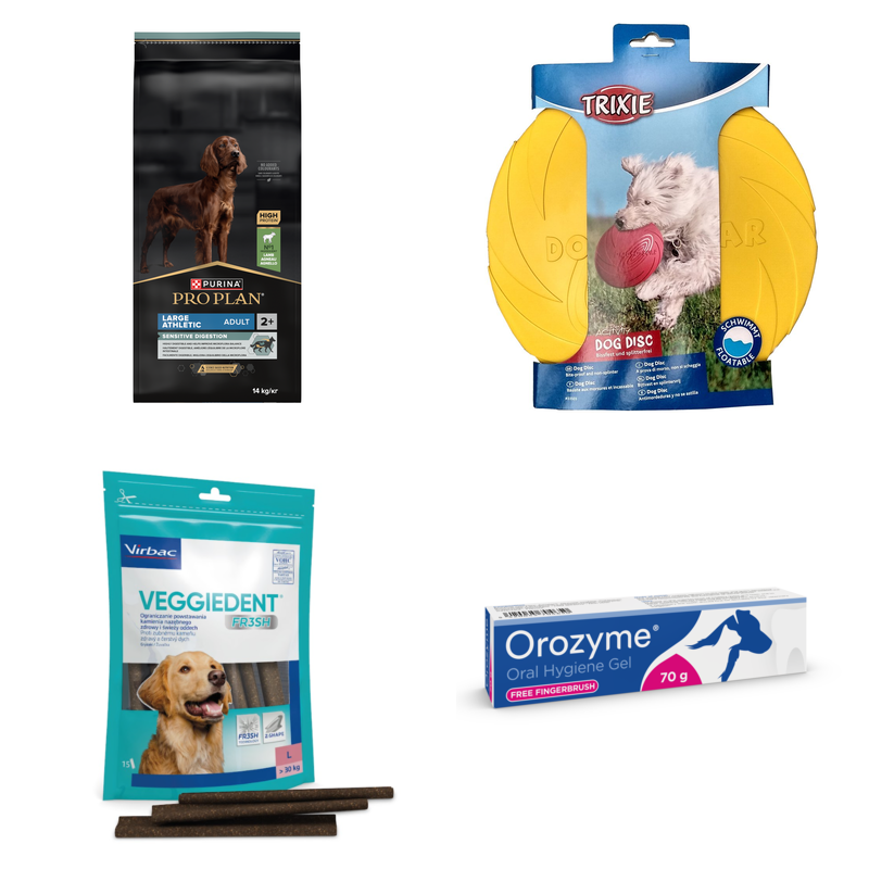 Comiesięczny zestaw dla dorosłego psa dużej rasy (25 kg+): karma Pro Plan Jagnięcina 14 kg, frisbee, gryzaki Virbac L i żel Orozyme.