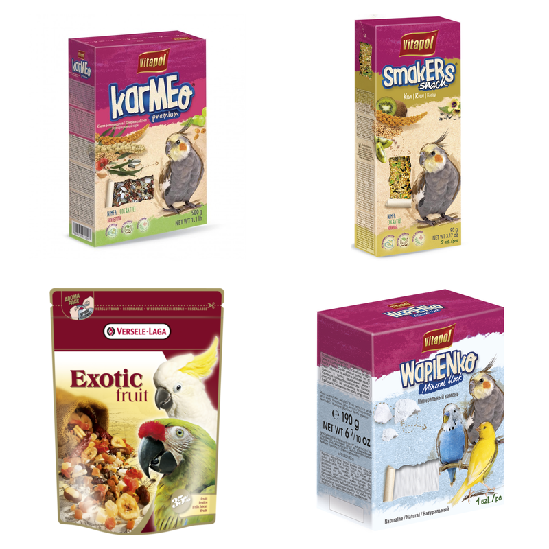 Gotowy zestaw dla nowego właściciela papugi falistej, nimfy lub innej małej papugi. Pokarm, przekąski, owoce egzotyczne i kostka wapienna.