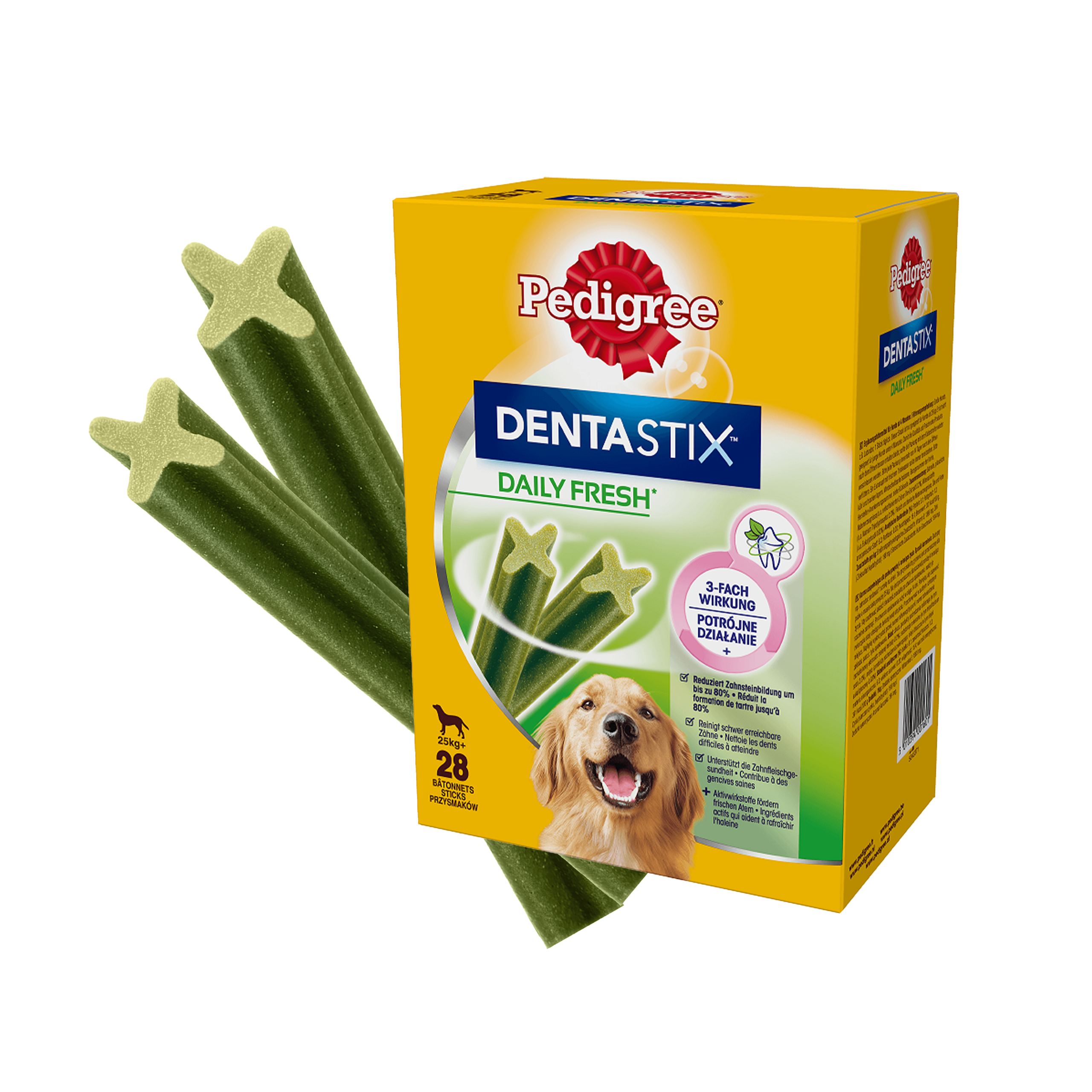 PEDIGREE® DentaStix™ Daily Fresh to karma uzupełniająca dla psów powyżej 4. miesiąca życia. Dzięki składnikom aktywnym i unikalnej mieszance z ekstraktu z zielonej herbaty i olejku eukaliptusowego odświeży oddech Twojego pupila. Podawaj codziennie swojemu psu pyszny i skuteczny przysmak dentystyczny PEDIGREE® DENTASTIX™ Daily Fresh, aby mógł zachować zdrowe i silne dziąsła. Przysmaki nie zawierają cukrów, sztucznych barwników i dodatków smakowych. Przeznaczone są wyłącznie dla zwierząt o masie ciała powyżej 25 kg.