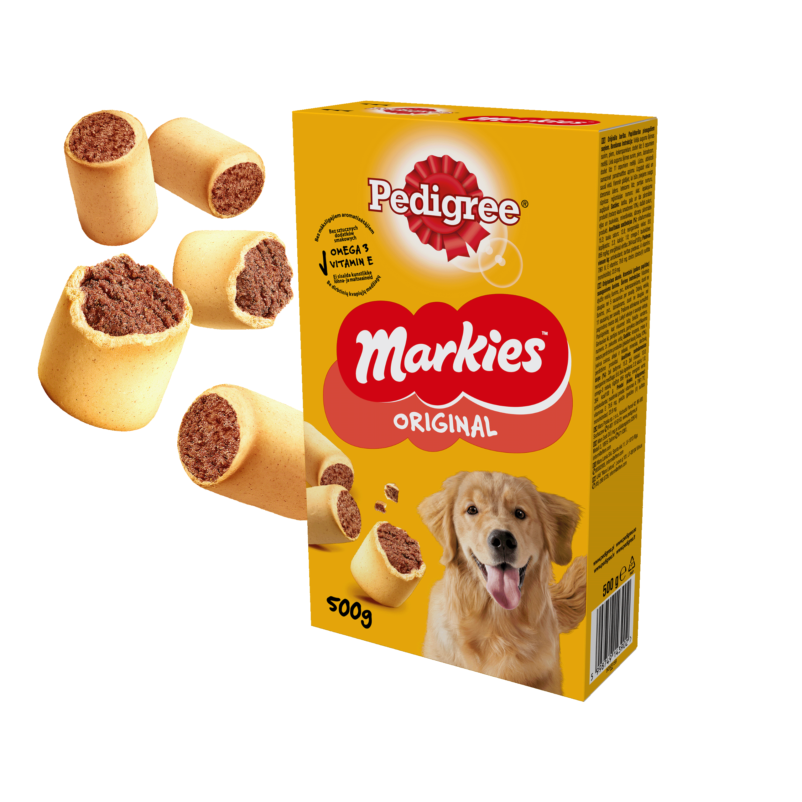 PEDIGREE® Markies Original to wyśmienite ciasteczka, dzięki którym nie tylko sprawisz swojemu pupilowi przyjemność, ale z też zadbasz o jego zdrowie i witalność. Przysmak zawiera witaminy i kwasy Omega-3, które pomogą utrzymać Twojego psa w dobrej formie przez całe życie. Zawarty w składzie wapń pomaga w utrzymaniu zdrowych kości i zębów, a dodatek witamin i minerałów działa pozytywnie na układ odpornościowy. PEDIGREE® Markies Original to chrupiąca przyjemność dla Twojego pupila.
