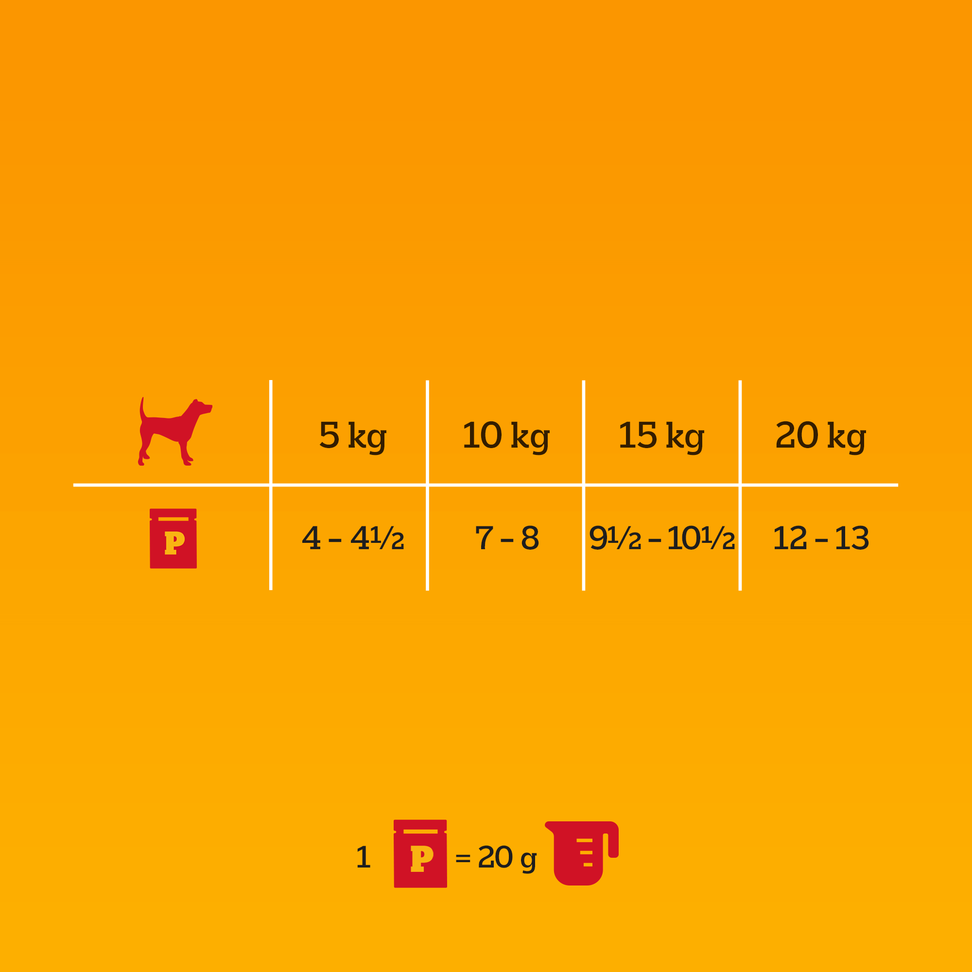 Pies o masie ciała 20 kg potrzebuje 10( 1)/2 saszetki karmy mokrej lub 5 saszetek karmy mokrej i 125 g karmy suchej dziennie.