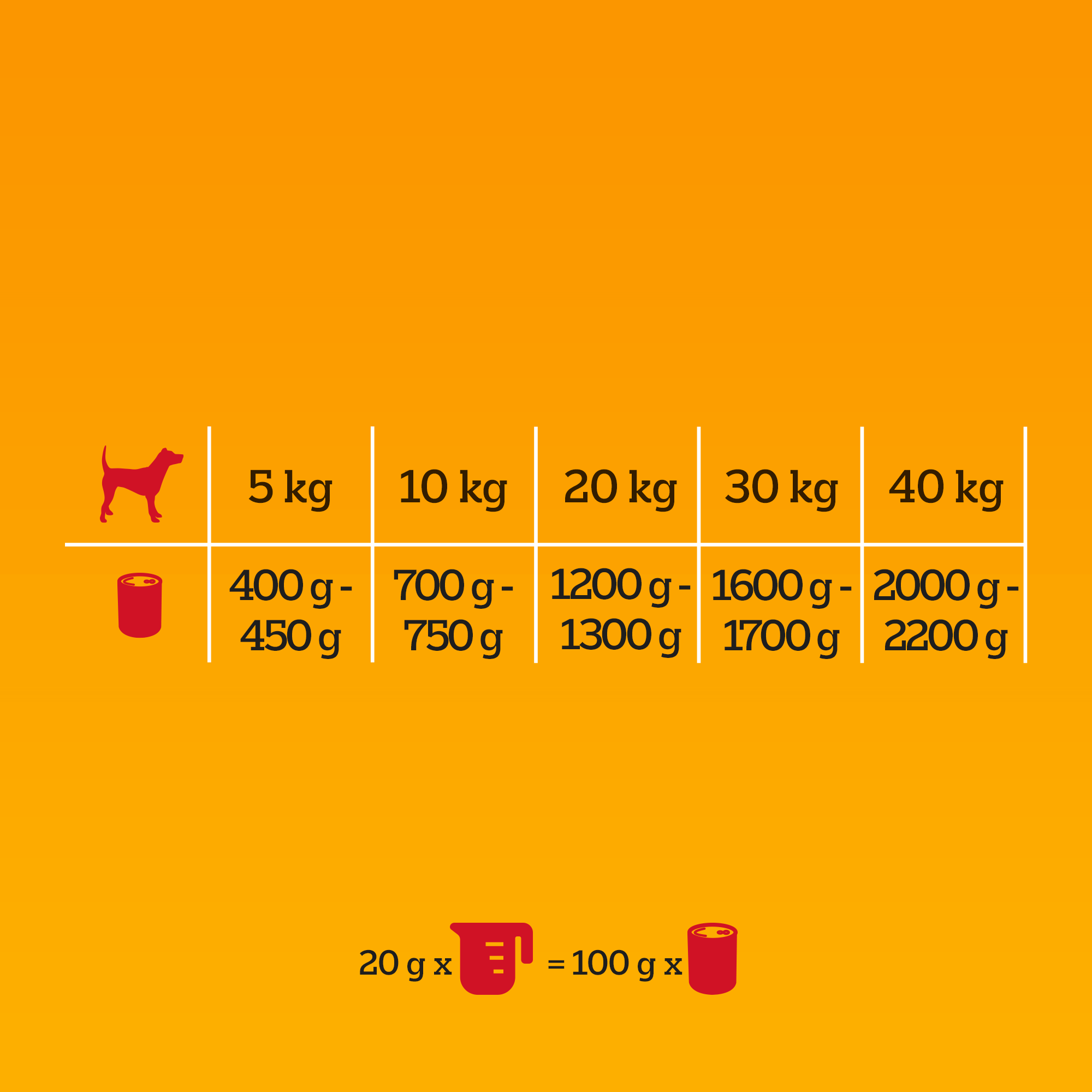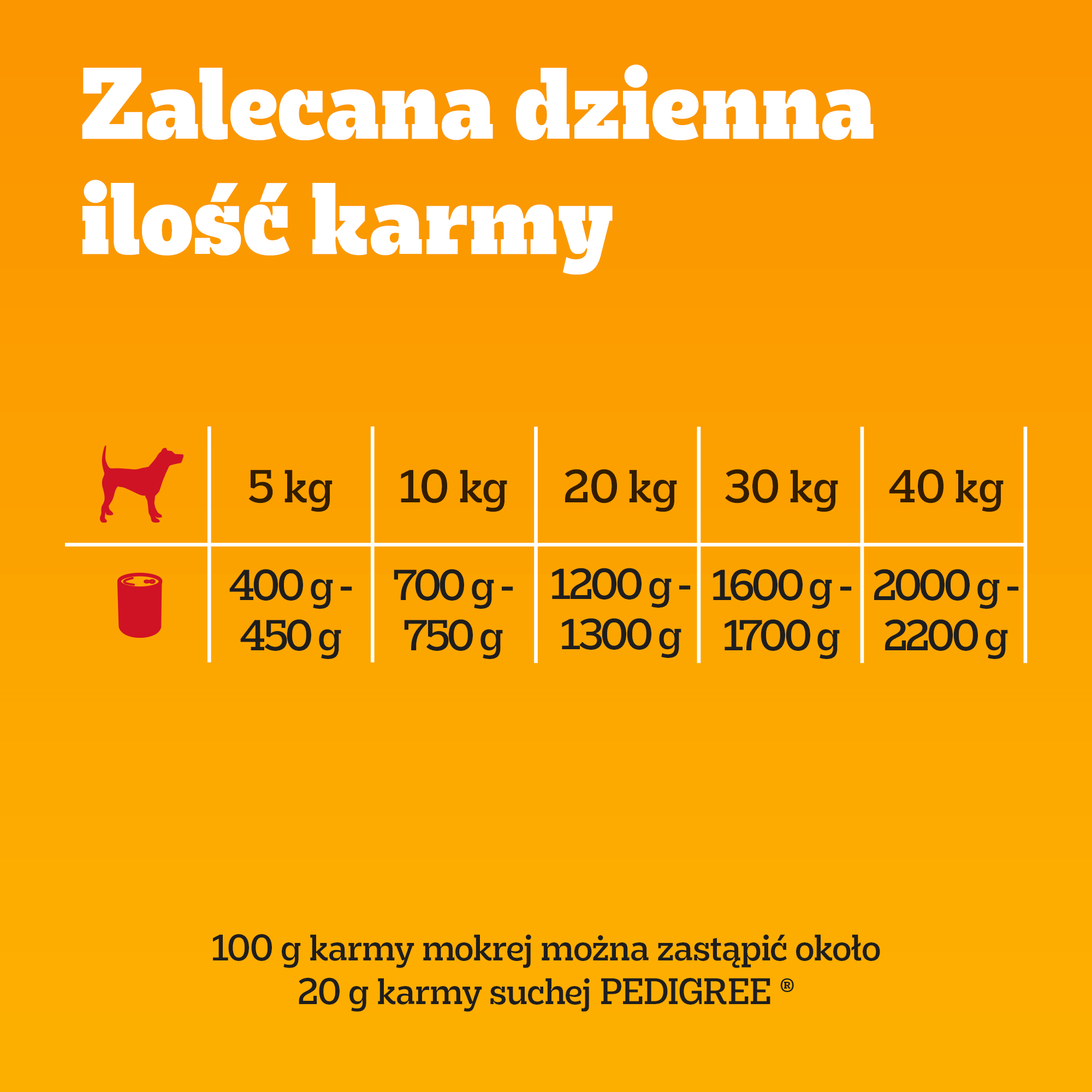 Zalecamy podawać zarówno karmę mokrą Pedigree, jak i karmę suchą. Uwzględnij okres przejściowy i dostosuj ilości pokarmu do potrzeb zwierzęcia. Zapewnij psu świeżą wodę do picia. Produkt należy podawać w temperaturze pokojowej. Niewykorzystaną część przechowywać w lodówce do 2 dni.