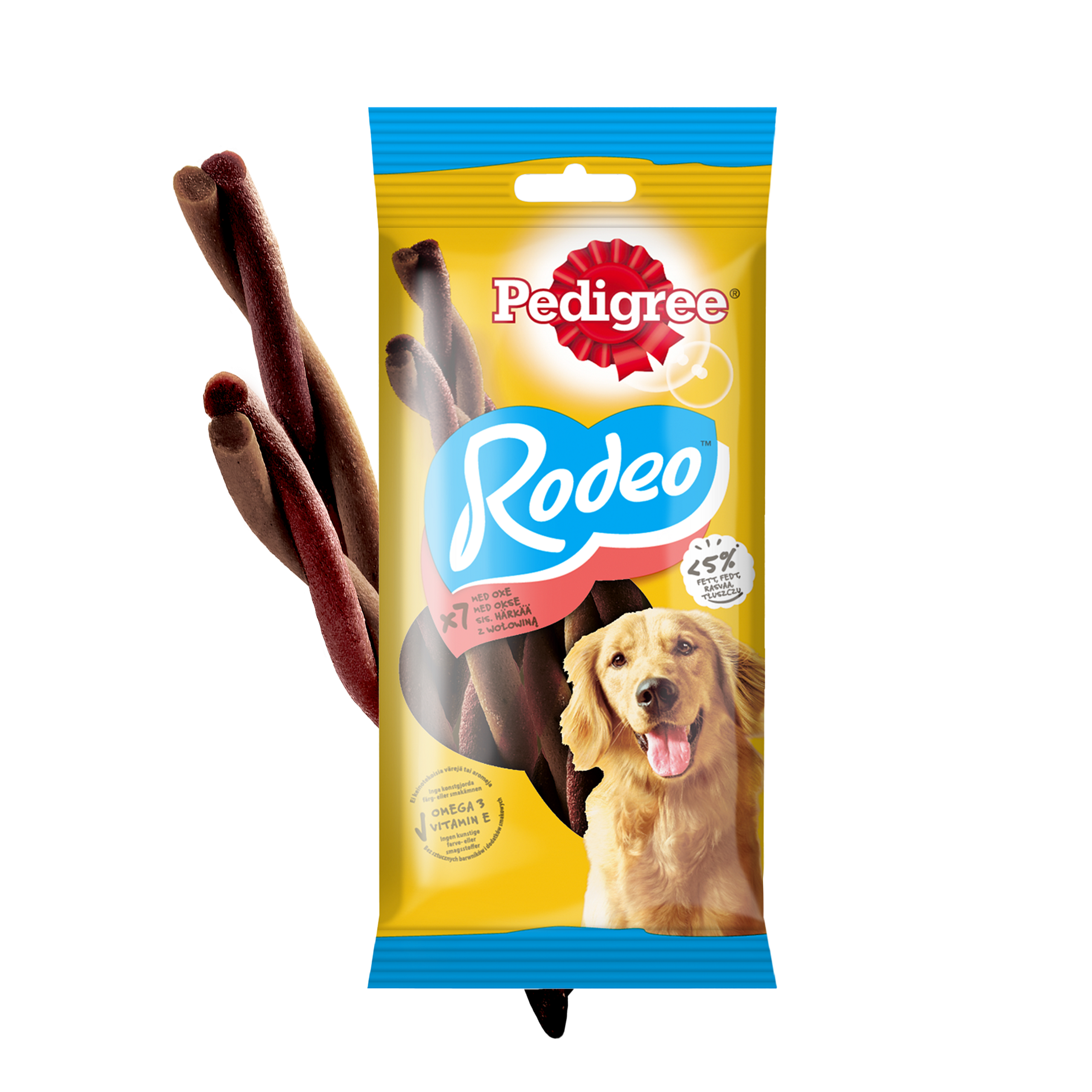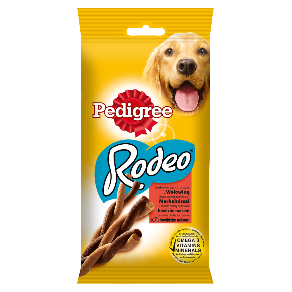 Pedigree Rodeo 122g to doskonały przysmak dla każdego psa o smaku wołowiny. Stanowi wartościowe uzupełnienie codziennej diety zwierzęcia. Przeznaczony jest zarówno dla dorosłych osobników, jak i seniorów. Przysmak dla psów podawać możesz od 4 miesiąca życia i powyżej 5kg masy ciała. Kształt sprężynki oraz gumowa struktura z pewnością przypadną im do gustu. Ponadto opakowanie jest podzielne, dzięki czemu wystarczy Ci na kilka porcji. Produkt wyróżnia się bogatym składem, który zapewni Twojemu psu prawidłową formę oraz zdrowie już od najmłodszych lat. W składzie przysmaku Pedigree Rodeo znajdziesz minerały, witaminy oraz wartościowe kwasy omega 3. Dzięki temu możesz mieć pewność, że Twój pies będzie miał również zwiększoną odporność oraz mocniejsze kości.