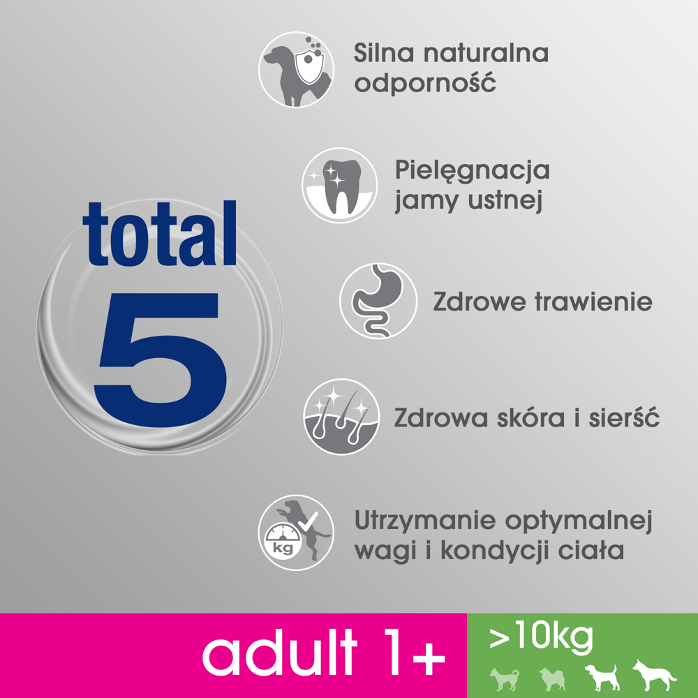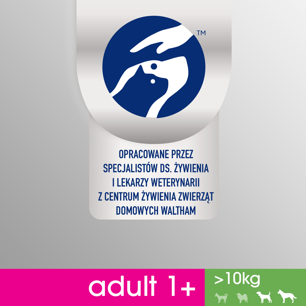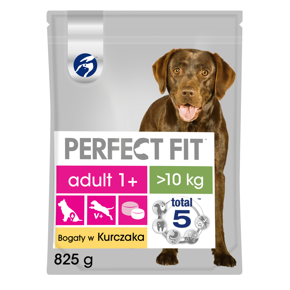 Receptura pełnoporcjowego, zbilansowanego i smacznego jedzenia dla psa Perfect Fit Adult 1+ Bogaty w Kurczaka została opracowana przez lekarzy weterynarii oraz specjalistów ds. żywienia. Naukowcy z Instytutu Nauki o Zwierzętach WALTHAM przeanalizowali najczęściej występujące problemy ze zdrowiem u psów powyżej 1 roku życia, co stało się podstawą do opracowania żywienia z formułą Total 5, która wspiera 5 najważniejszych obszarów zdrowia dorosłego psa. Wśród nich silny układ odpornościowy, zdrowe trawienie, zdrową skórę i sierść, pielęgnację jamy ustnej, a także optymalną kondycję i masę ciała. Odpowiednie żywienie psa dużej rasy przekłada się bezpośrednio na jego lepsze zdrowie, aktywność oraz rozwój umysłowy. Karma Perfect Fit Adult 1+ Bogaty w Kurczaka wspomoże Cię w prawidłowym zaspokajaniu codziennych potrzeb psów powyżej 10kg masy ciała.