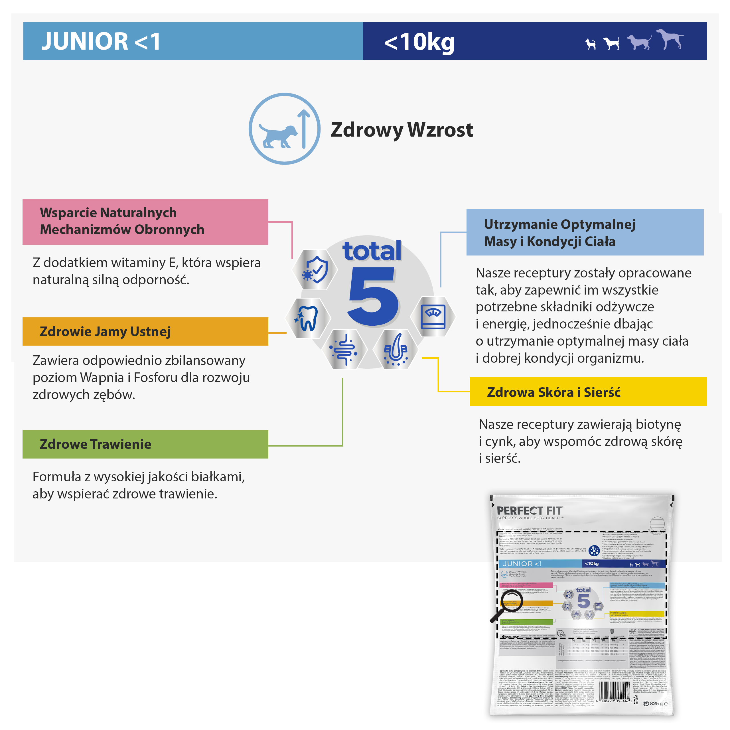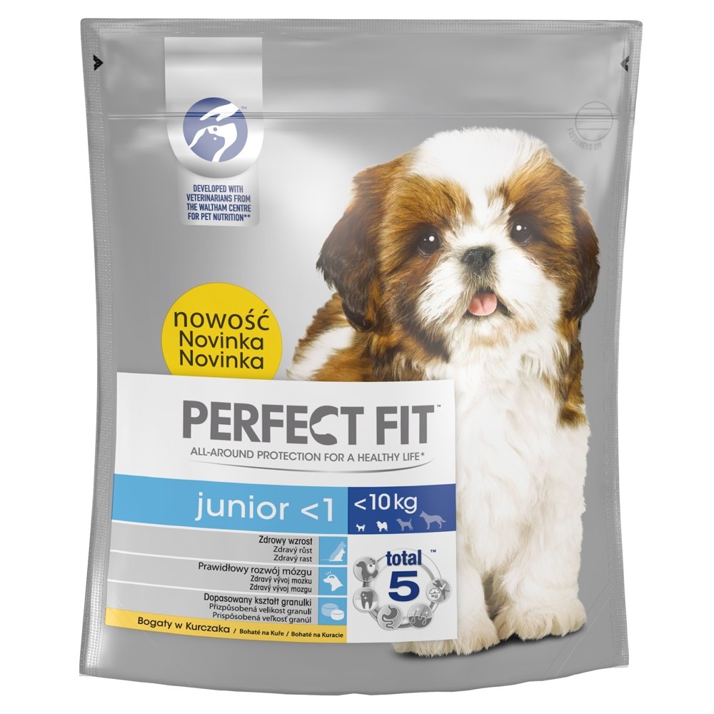 Sucha karma dla szczeniąt Perfect Fit Junior <1 Bogaty w Kurczaka jest pełnoporcjowym i zbilansowanym jedzeniem dla szczeniąt do 1 roku życia, małych ras (do 10kg). Wyróżnia ją receptura, opracowano ją przy udziale lekarzy weterynarii oraz specjalistów ds. żywienia z Instytutu Nauki o Zwierzętach WALTHAM. Naukowcy przeanalizowali najczęściej występujące u psów problemy ze zdrowiem, co pozwoliło im opracować innowacyjną karmę z formułą Total 5. Wspomaga ona 5 najważniejszych obszarów zdrowia pupila: zapewnia silny układ odpornościowy, pielęgnację jamy ustnej, zdrowe trawienie, zdrową skórę i sierść, a także utrzymanie optymalnej kondycji i masy ciała. Ta karma dla szczeniaka, dzięki zawartości wapnia i fosforu, to codzienne wsparcie jego zdrowego wzrostu.